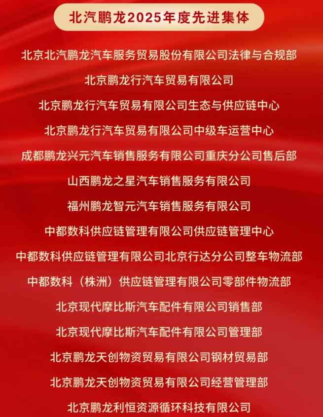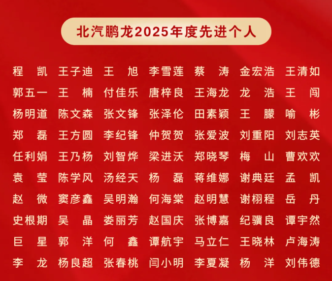 15个集体被授予“北汽鹏龙2025年度先进集体”荣誉称号,70名职工被授予“北汽鹏龙2025年度先进个人”荣誉称号。
